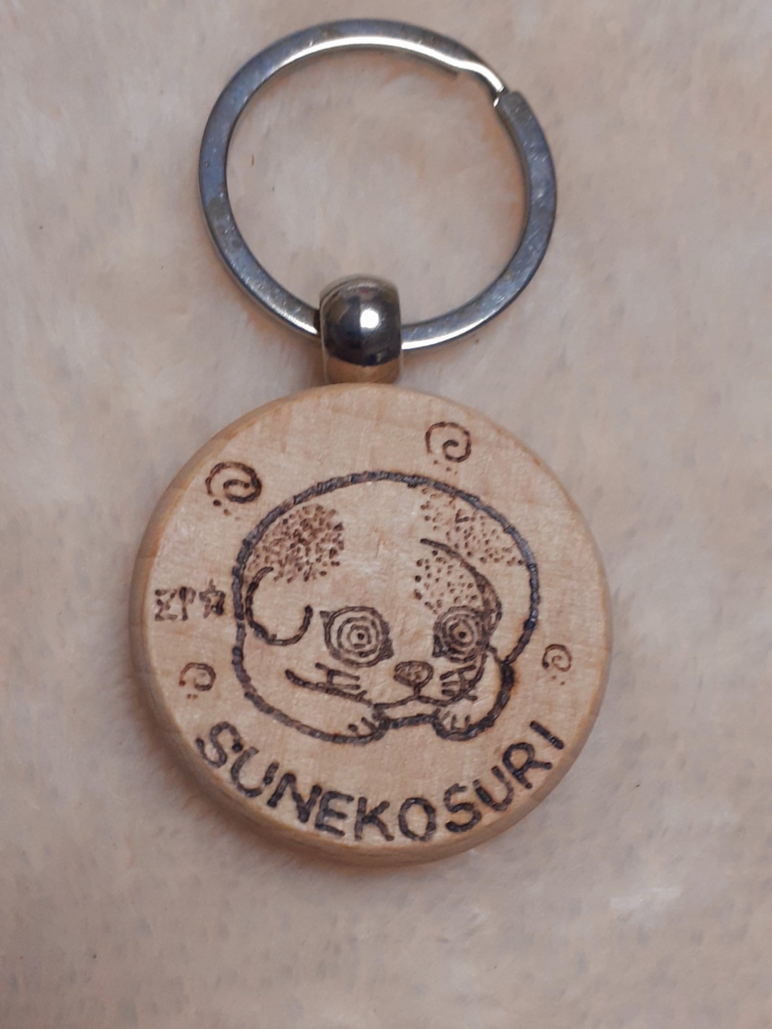 木製キーリングに熱ペンでイラストを手描きした一点ものです