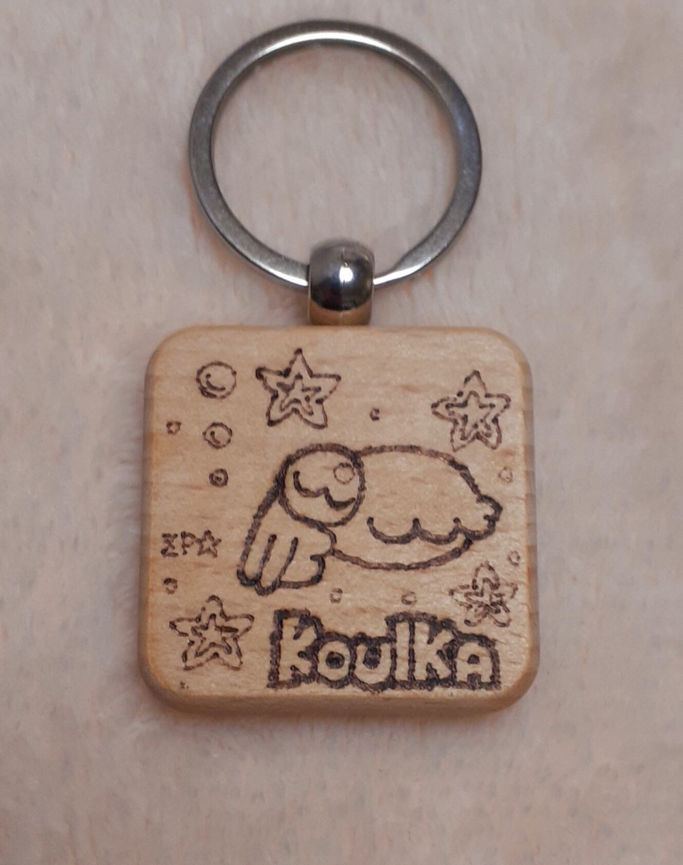 木製キーリングに熱ペンでイラストを手描きした一点ものです