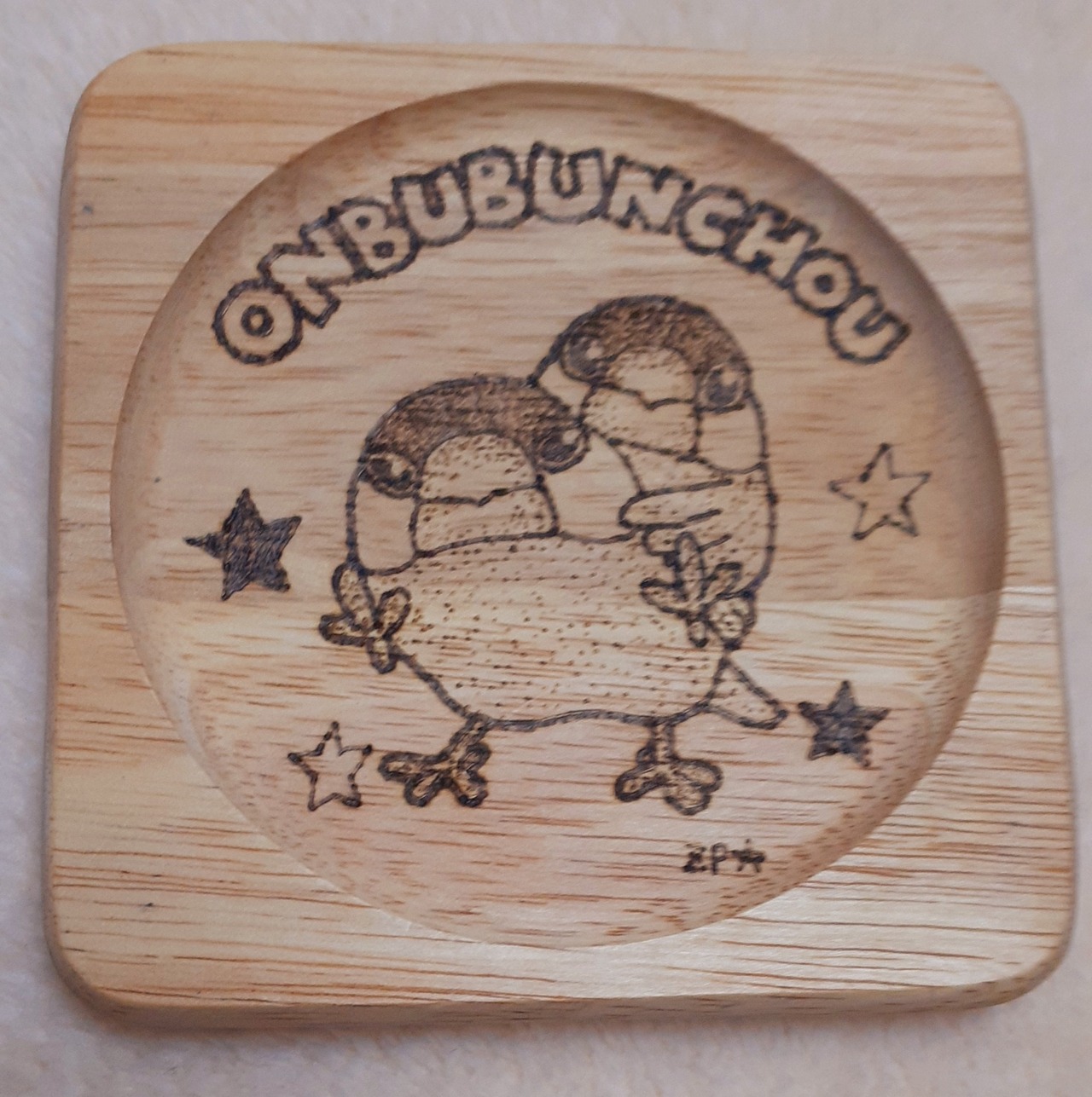 木製コースターに熱ペンでイラストを手描きした一点ものです