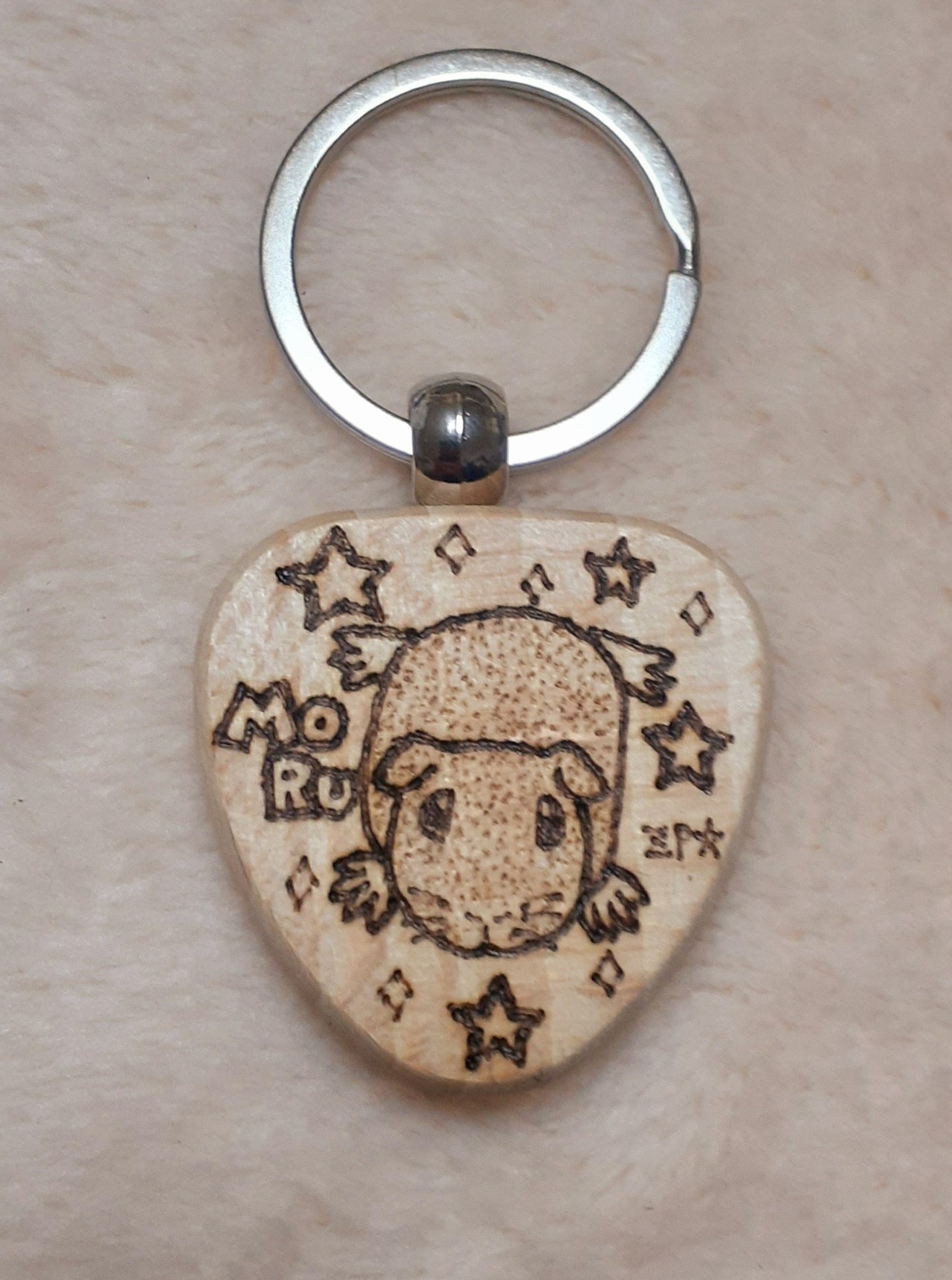 木製キーリングに熱ペンでイラストを手描きした一点ものです