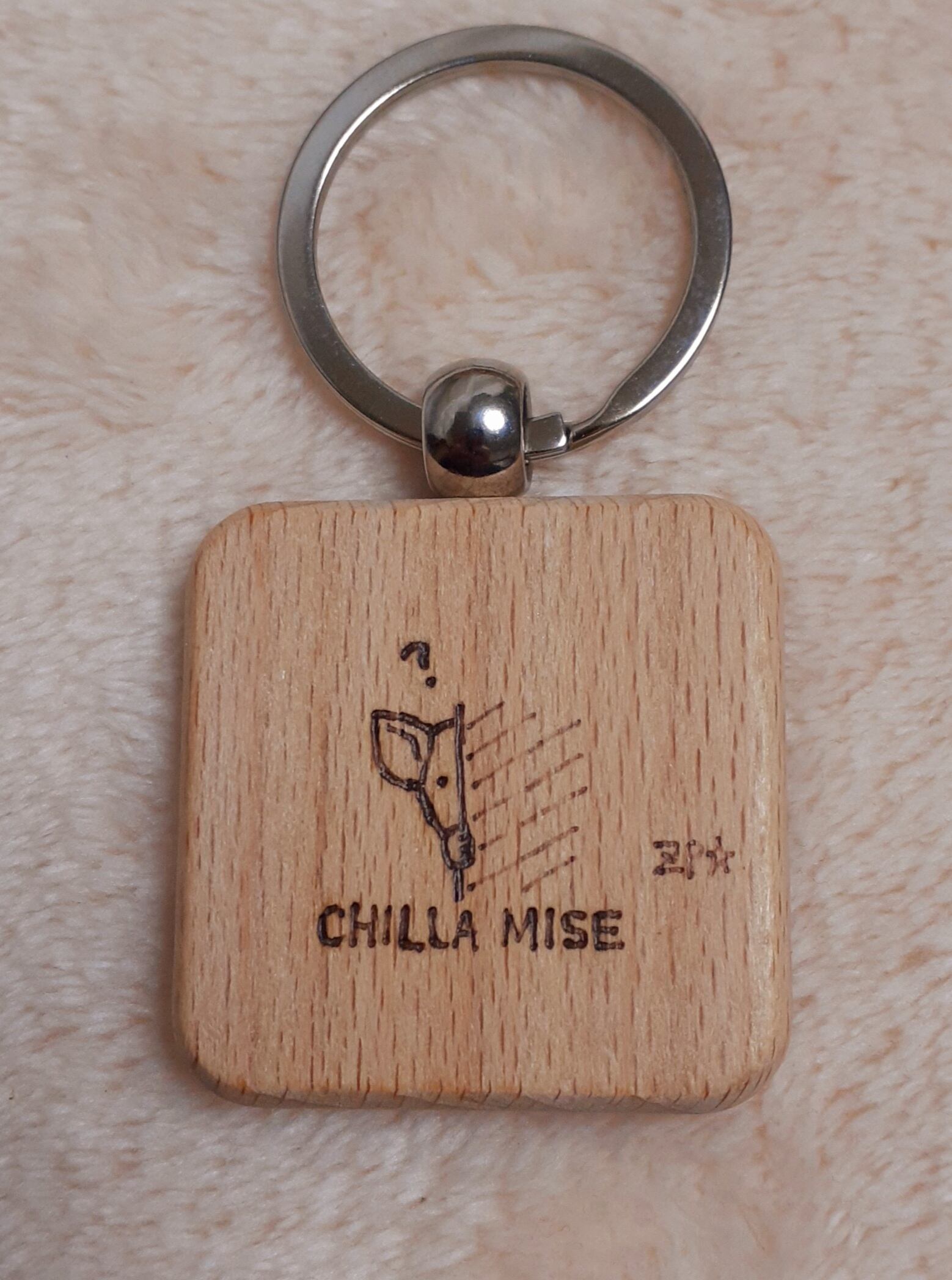 木製キーリングに熱ペンでイラストを手描きした一点ものです