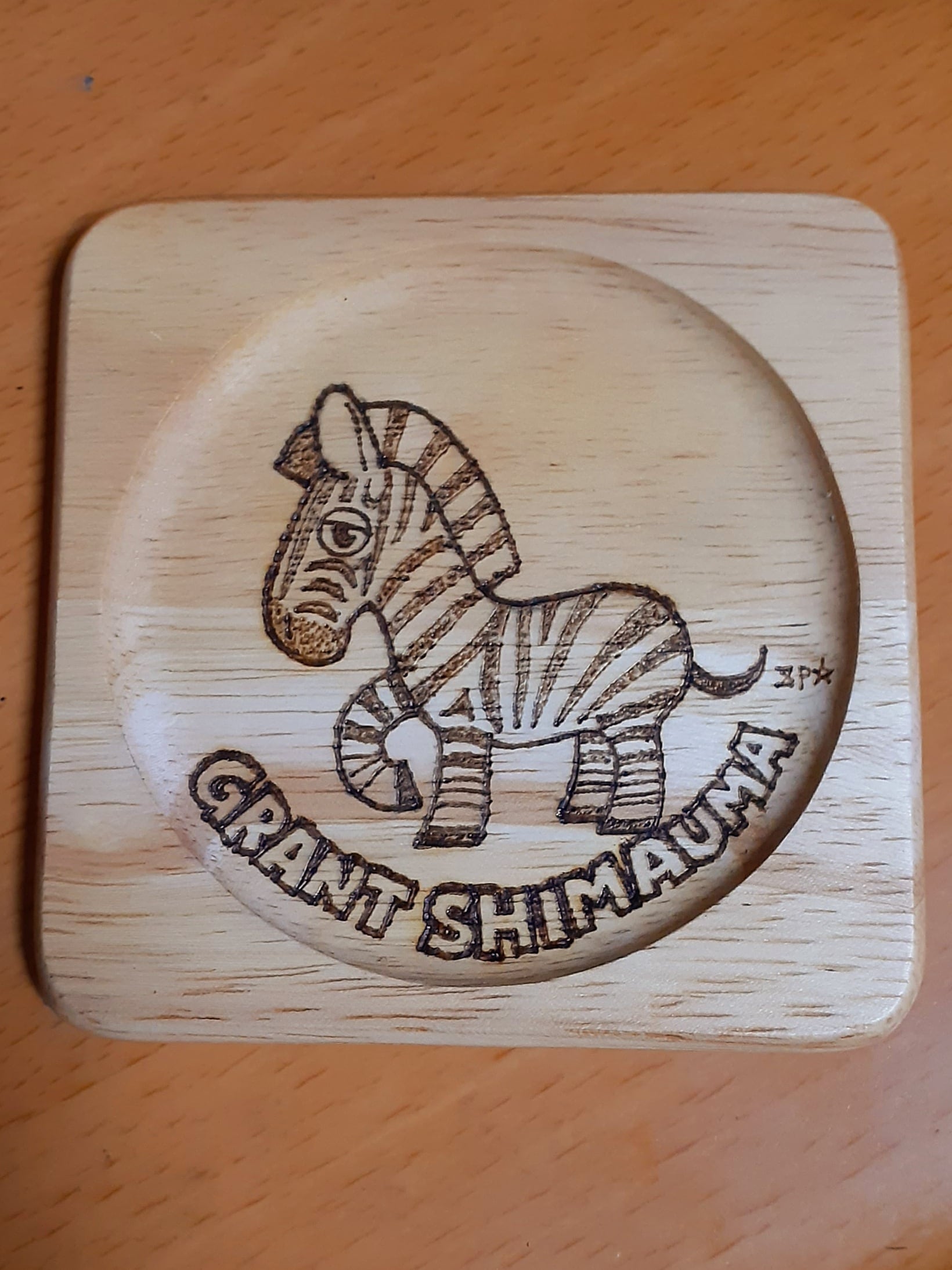 木製コースターに熱ペンでイラストを手描きした一点ものです